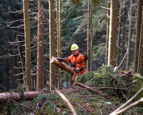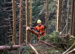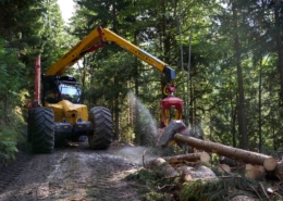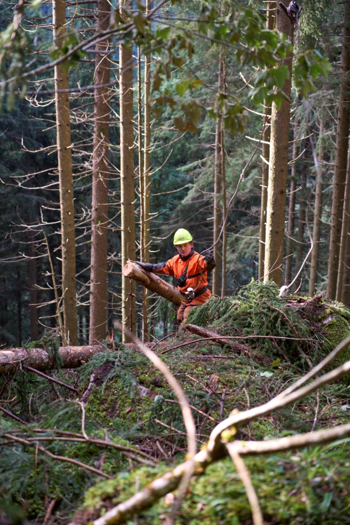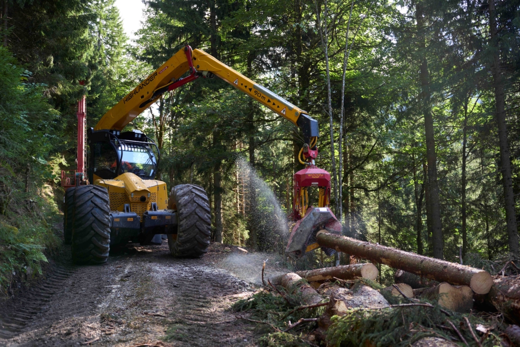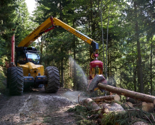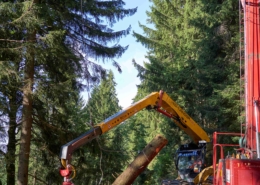 Aktuell wird das aufgerüstete Holz mit modernster Seilkrantechnik gerückt, entastet, auf die gewünschten Längen eingeschnitten und für den Abtransport vorbereitet.