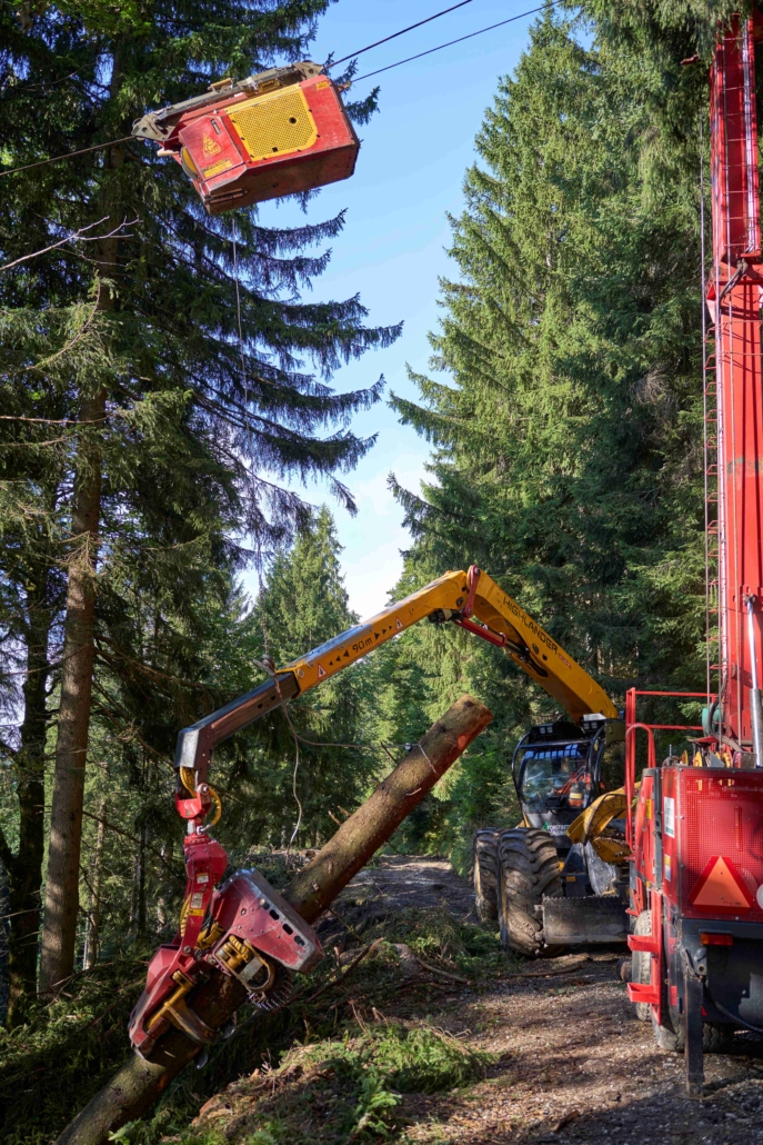 Forstwart Silvan Waber bildet im Wald optimale Holzlasten, zieht diese mit dem Seilkran hoch und schickt den Laufwagen selbstfahrend zur Abladestation. Dort übernimmt Maschinist Michael Kämpf die Last, öffnet die Seilstrupen per Fernsteuerung und verarbeitet die Stämme mit dem Vollernteraggregat weiter.