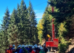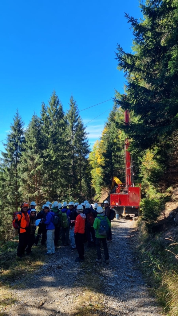 Bei der anschliessenden Begehung eines Seilkraneinsatzes im Gebirgswald konnten die Studierenden die anspruchsvolle Holzernte im Steilgelände aus nächster Nähe erleben.