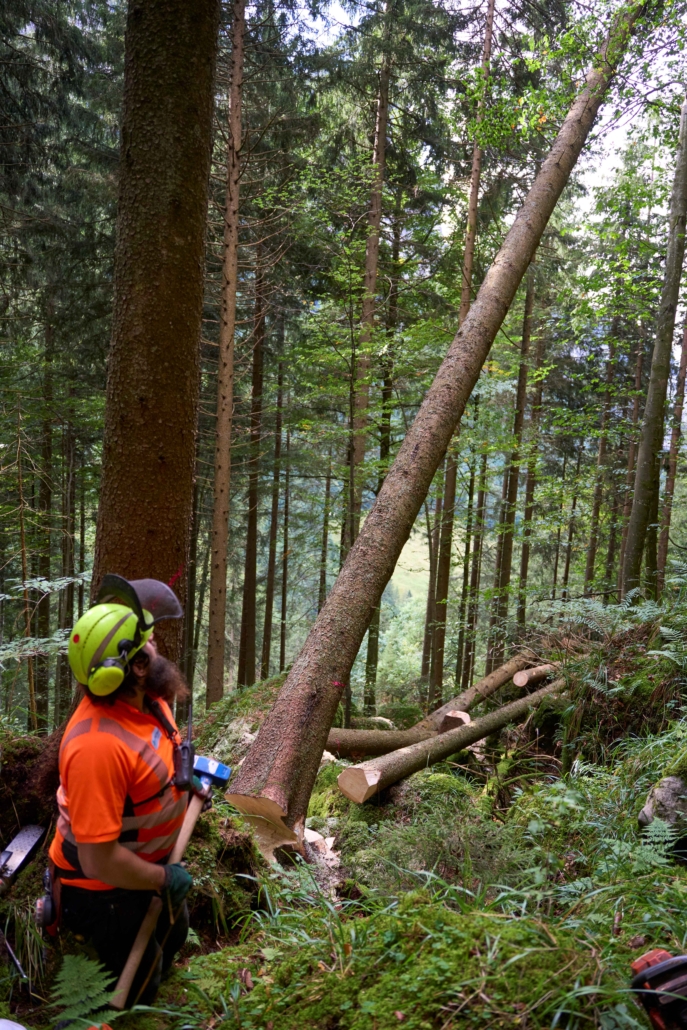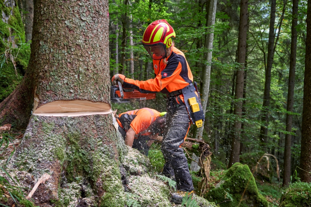 Ein besonderer Moment für Kathrin und Silas im ersten Lehrjahr: Unter der fachkundigen Anleitung von Michael Kämpf durften sie selbst Hand anlegen. Mit viel Einsatz und Begeisterung meisterten sie die verantwortungsvolle Aufgabe. Für die jungen Forstleute war es ein eindrückliches Erlebnis, Holz für ein so bedeutendes Bauwerk vorzubereiten.