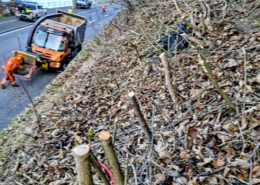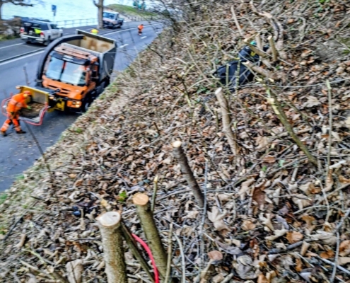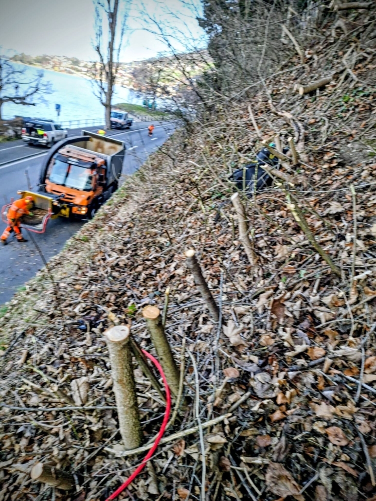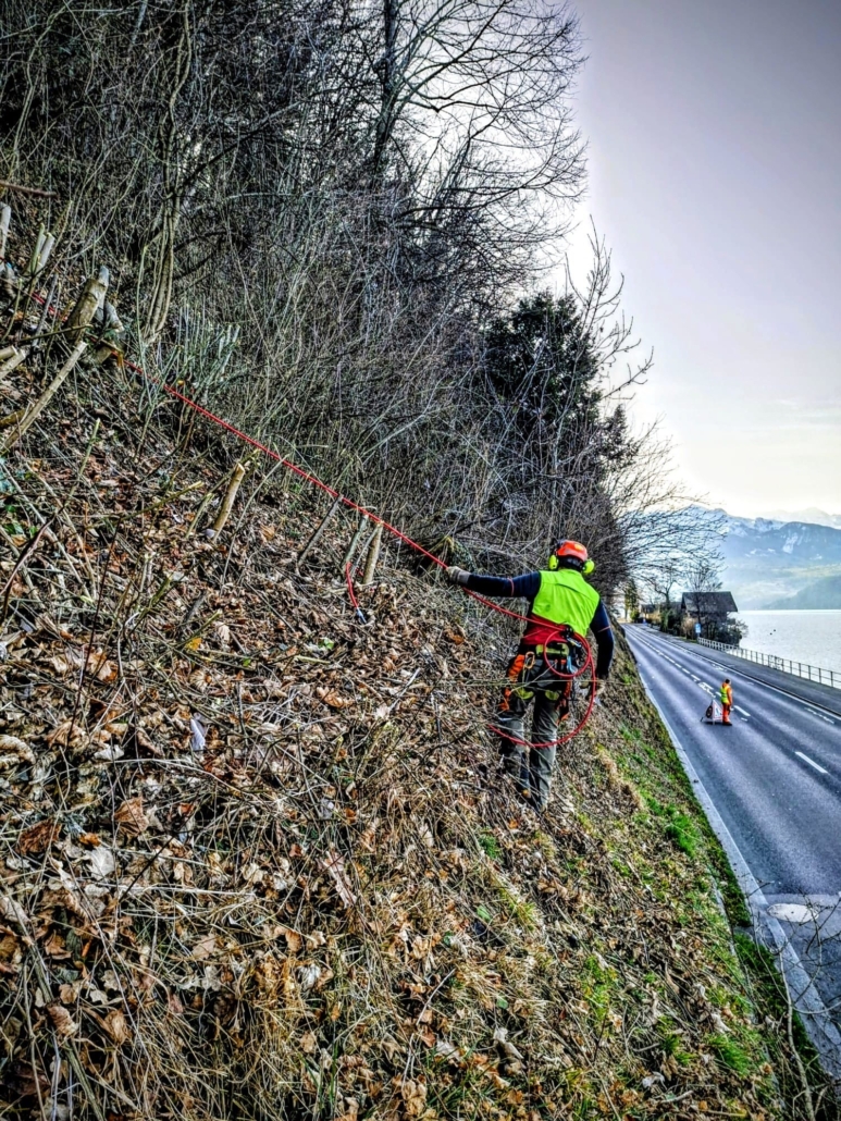 Oberhalb der Kantonsstrasse realisieren wir in Zusammenarbeit mit dem kantonalen Tiefbauamt ein eingehend geplantes Niederwaldprojekt. Ziel dieser Massnahme ist es, das Risiko von Sturzholz entlang der Strasse nachhaltig zu reduzieren und künftige, aufwendige Sicherheitsholzereien möglichst zu vermeiden.