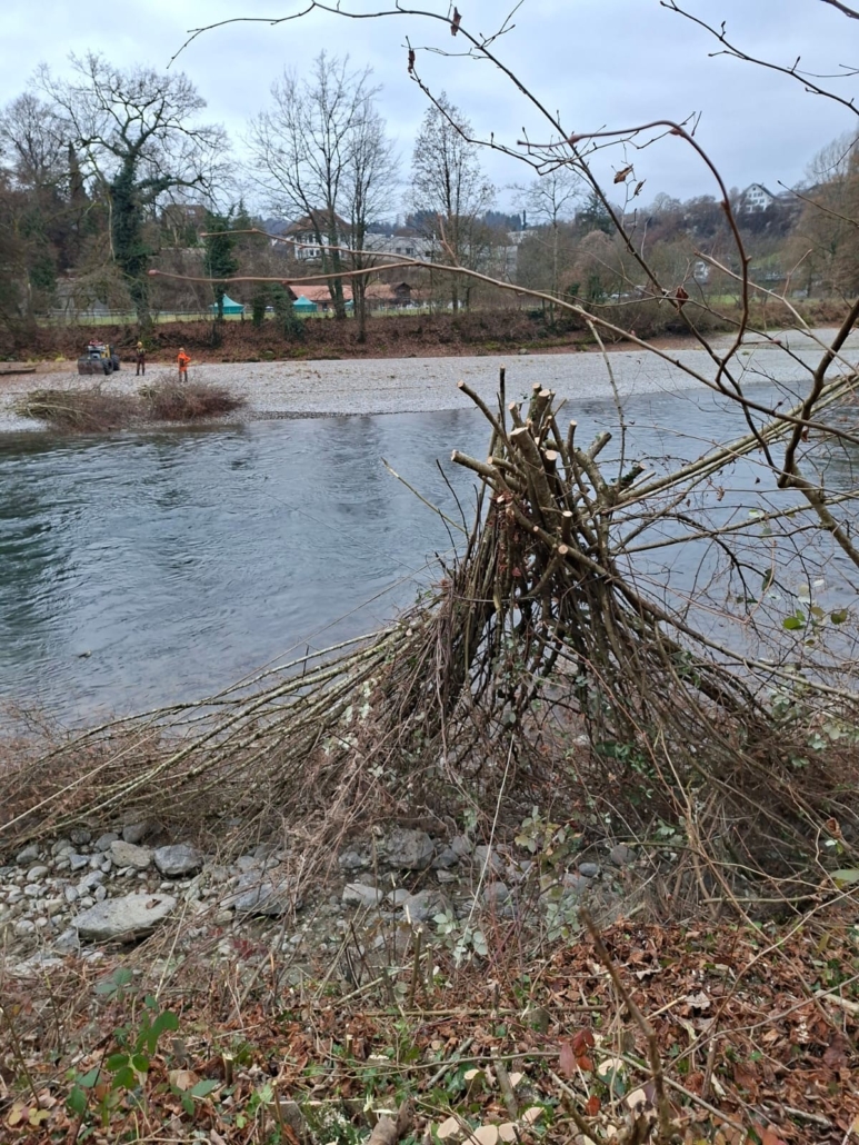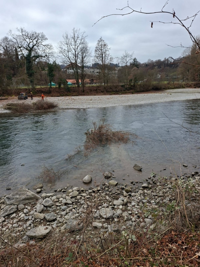 In Bremgarten waren unsere Forstmitarbeitenden in einem besonders anspruchsvollen Abschnitt im Einsatz: In einem Gebiet ohne direkte Zufahrt wurde das anfallende Astmaterial mit Hilfe eines kleinen Rückegeräts über die Aare gezogen und auf der gegenüberliegenden Seite zu einem Haufen geschichtet.
